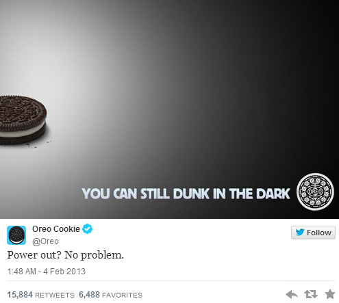 The famous example that everyone cites is Oreo’s “Dunking in the Dark” tweet. During the Superbowl XLVII in 2013, there was a power outage. Oreo took to Twitter and immediately tweeted this: