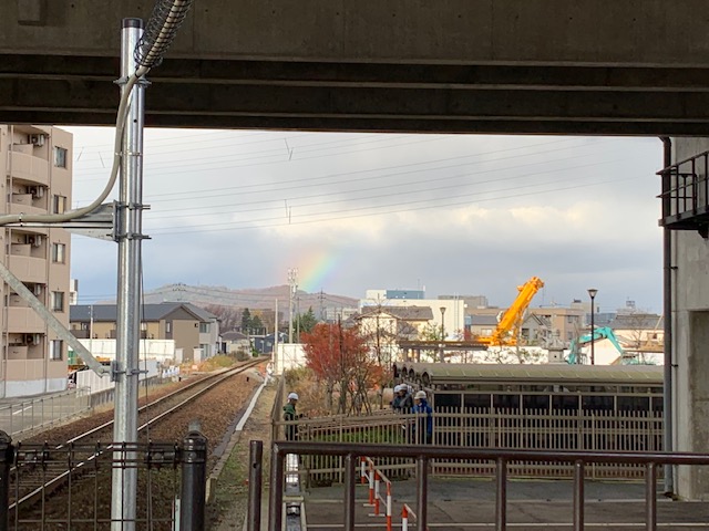 From Shin-Takaoka station, I took a 3-minute walk to a local train stop and waited about 3 minutes for a train to come. I saw a rainbow. The final train ride was also 3 minutes. Kazu met me at Takaoka station.