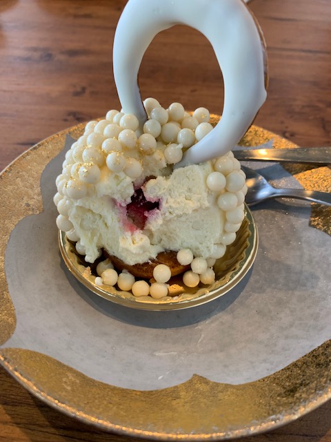 You can see the adorable face of Buddha in the milk foam of my latte. I also had a little white chocolate pudding cake inspired by the shape of Buddha’s head and halo. It was really delicious, and you can see the raspberry filling in a later picture. It was so rich that I almost couldn’t finish it…but we sat chatting for over two hours, so I made it happen.
