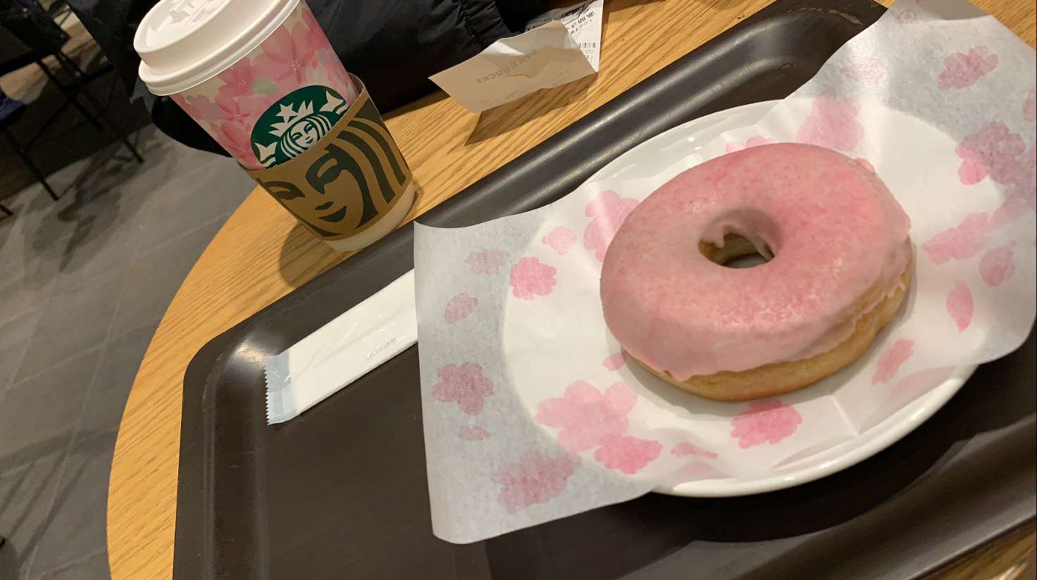 You’re seeing sakura koshianman, which are like steamed buns with sakura filling, a convenience store roll cake, a bagel with sakura filling and a dried (maybe pickled?) flower on top, and a Starbucks latte (actually just a regular soy milk latte, but the cup is appropriate for this post) and sakura donut.