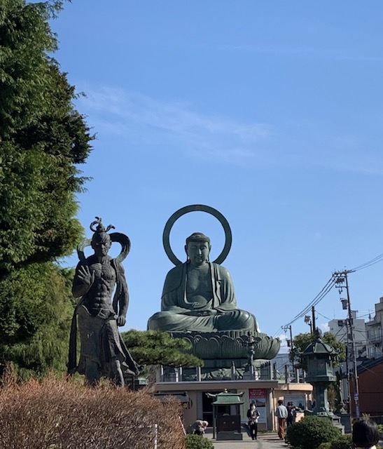 That’s a lantern that seems to be sponsored by a tobacco company, a picture of me in a New Realm Brewing Company cap (Kazu said I look like my mother), and the great Buddha of Takaoka.